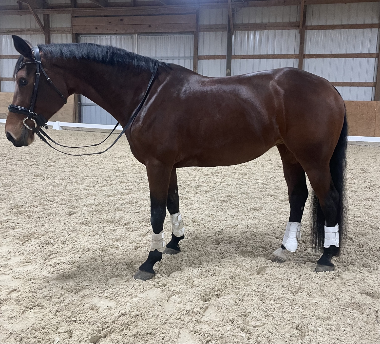 Ella is an exciting young mare by Furstenball out of an Idocus mare. She has supermodel good looks, the sweetest disposition with beautiful gaits and super rideability. Currently schooling third level with a nice expressive change, elastic gaits with an excellent hindleg. She is calm, confident and easy to ride and work with, yet sensitive enough to the aids to excel in the FEI ring. Sound, healthy and an easy keeper. Great with farrier, vet, trailering,. Hacks out alone, An amazing opportunity for an amateur or young rider to enjoy bringing up through the levels. Would also be a great prospect for a professional to develop.